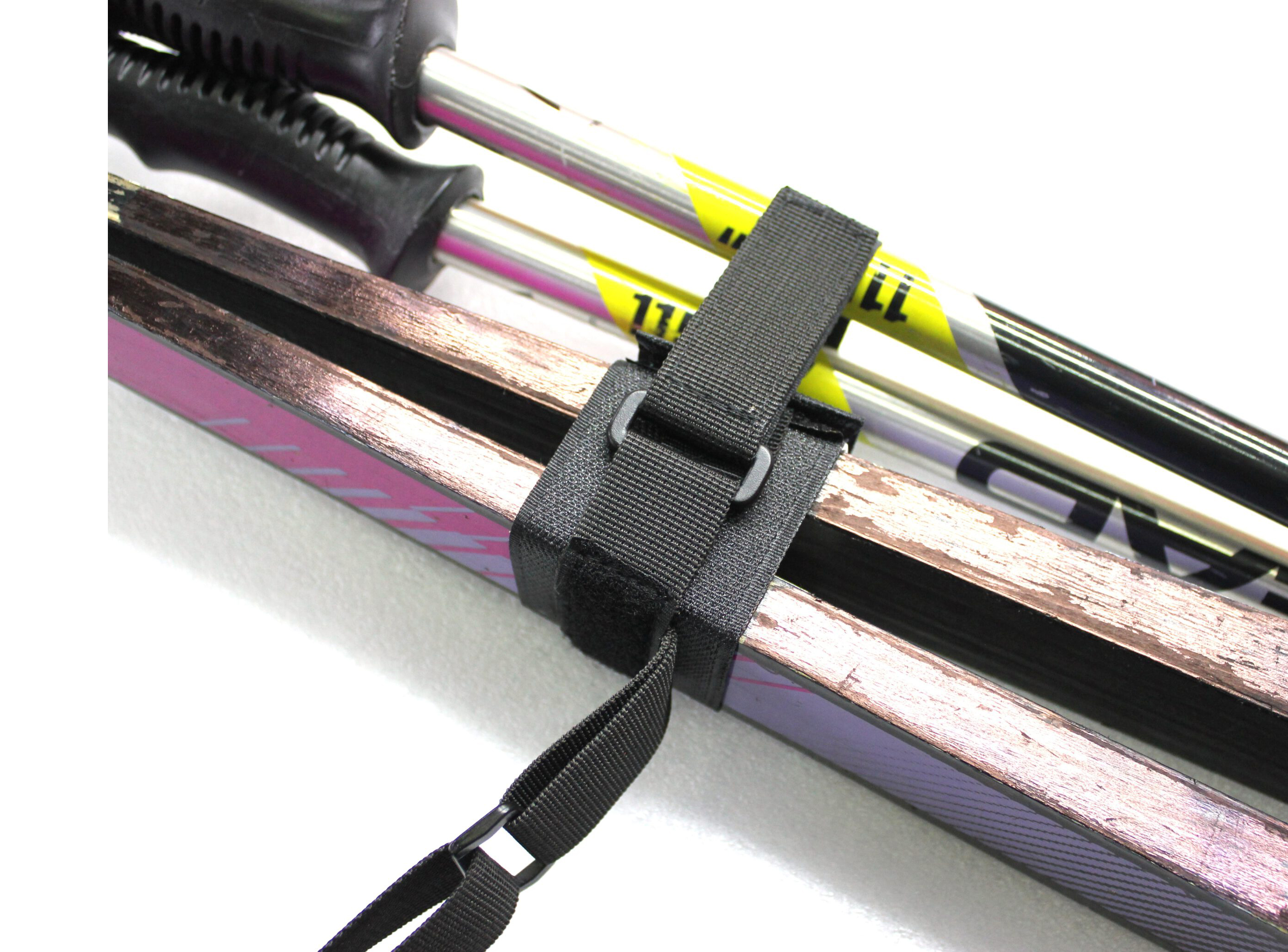 - Порядок крепления стяжки-переноски производится в следующем порядке — зажимаете вспененный полиэтилен между лыж и закручиваете до момента фиксации липучки, при этом сначала фиксируются лыжи, потом фиксируются палки