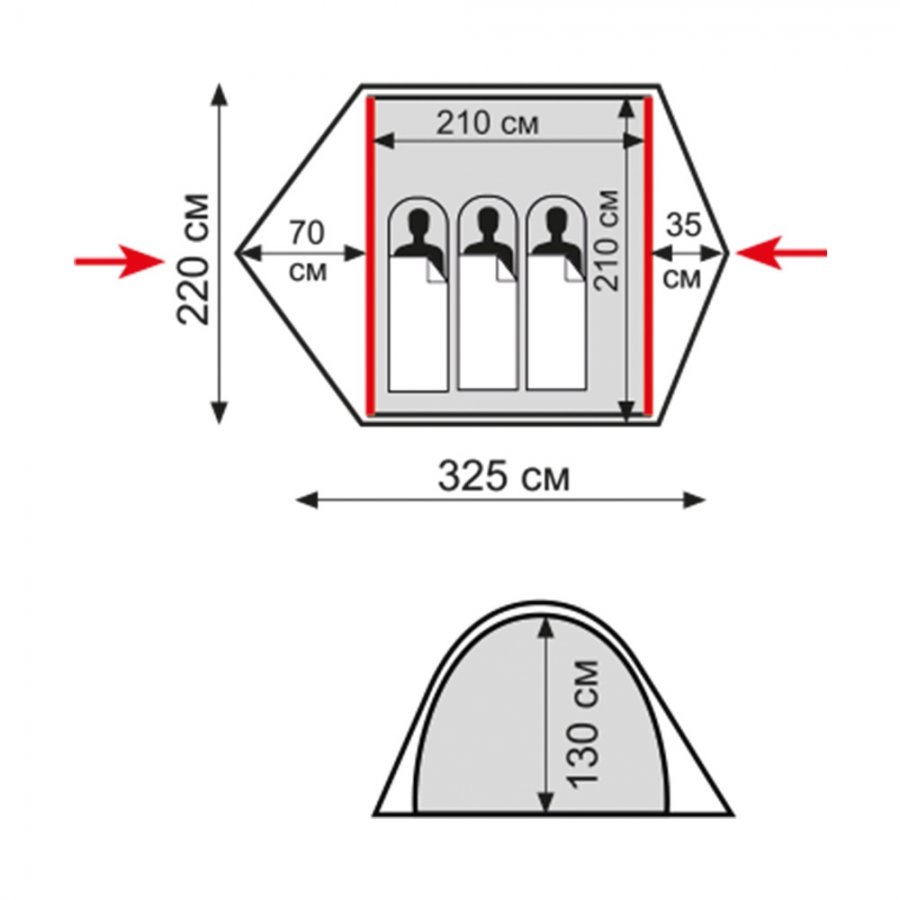 - Размер внутренней палатки: 210 х 210 х 130 см